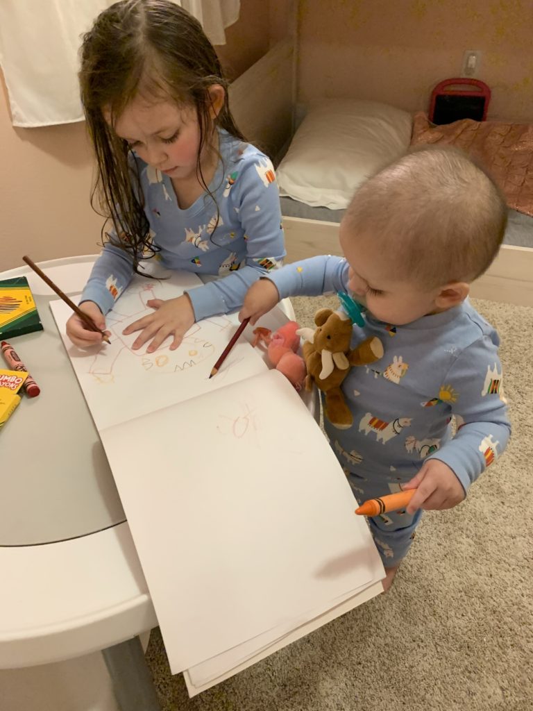 (He’s so sneaky and finds pens, pencils, and crayons, and runs to this part of the wall to write)